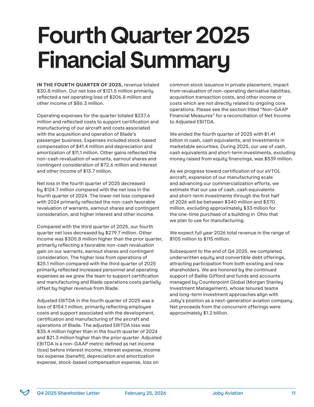 Fourth Quarter 2025 Financial Summary IN THE FOURTH QUARTER OF 2025, revenue totaled $30.8 million. Our net loss of $121.5 million primarily reflected a net operating loss of $206.8 million and other income of $86.3 million. Operating expenses for the quarter totaled $237.6 million and reflected costs to support certification and manufacturing of our aircraft and costs associated with the acquisition and operation of Blade’s passenger business. Expenses included stock-based compensation of $41.4 million and depreciation and amortization of $11.1 million. Other gains reflected the non-cash revaluation of warrants, earnout shares and contingent consideration of $72.6 million and interest and other income of $13.7 million. Net loss in the fourth quarter of 2025 decreased by $124.7 million compared with the net loss in the fourth quarter of 2024. The lower net loss compared with 2024 primarily reflected the non-cash favorable revaluation of warrants, earnout shares and contingent consideration, and higher interest and other income. Compared with the third quarter of 2025, our fourth quarter net loss decreased by $279.7 million. Other income was $305.8 million higher than the prior quarter, primarily reflecting a favorable non-cash revaluation gain on our warrants, earnout shares and contingent consideration. The higher loss from operations of $25.1 million compared with the third quarter of 2025 primarily reflected increased personnel and operating expenses as we grew the team to support certification and manufacturing and Blade operations costs partially offset by higher revenue from Blade. Adjusted EBITDA in the fourth quarter of 2025 was a loss of $154.1 million, primarily reflecting employee costs and support associated with the development, certification and manufacturing of the aircraft and operations of Blade. The adjusted EBITDA loss was $35.4 million higher than in the fourth quarter of 2024 and $21.3 million higher than the prior quarter. Adjusted EBITDA is a non-GAAP metric defined as net income (loss) before interest income, interest expense, income tax expense (benefit), depreciation and amortization expense, stock-based compensation expense, loss on common stock issuance in private placement, impact from revaluation of non-operating derivative liabilities, acquisition transaction costs, and other income or costs which are not directly related to ongoing core operations. Please see the section titled “Non-GAAP Financial Measures” for a reconciliation of Net Income to Adjusted EBITDA. We ended the fourth quarter of 2025 with $1.41 billion in cash, cash equivalents, and investments in marketable securities. During 2025, our use of cash, cash equivalents and short-term investments, excluding money raised from equity financings, was $539 million. As we progress toward certification of our eVTOL aircraft, expansion of our manufacturing scale and advancing our commercialization efforts, we estimate that our use of cash, cash equivalents and short-term investments through the first half of 2026 will be between $340 million and $370 million, excluding approximately $33 million for the one-time purchase of a building in Ohio that we plan to use for manufacturing. We expect full year 2026 total revenue in the range of $105 million to $115 million. Subsequent to the end of Q4 2025, we completed underwritten equity and convertible debt offerings, attracting participation from both existing and new shareholders. We are honored by the continued support of Baillie Gifford and funds and accounts managed by Counterpoint Global (Morgan Stanley Investment Management), whose tenured teams and long-term investment approaches align with Joby’s position as a next-generation aviation company. Net proceeds from the concurrent offerings were approximately $1.2 billion. Joby AviationQ4 2025 Shareholder Letter February 25, 2026 11