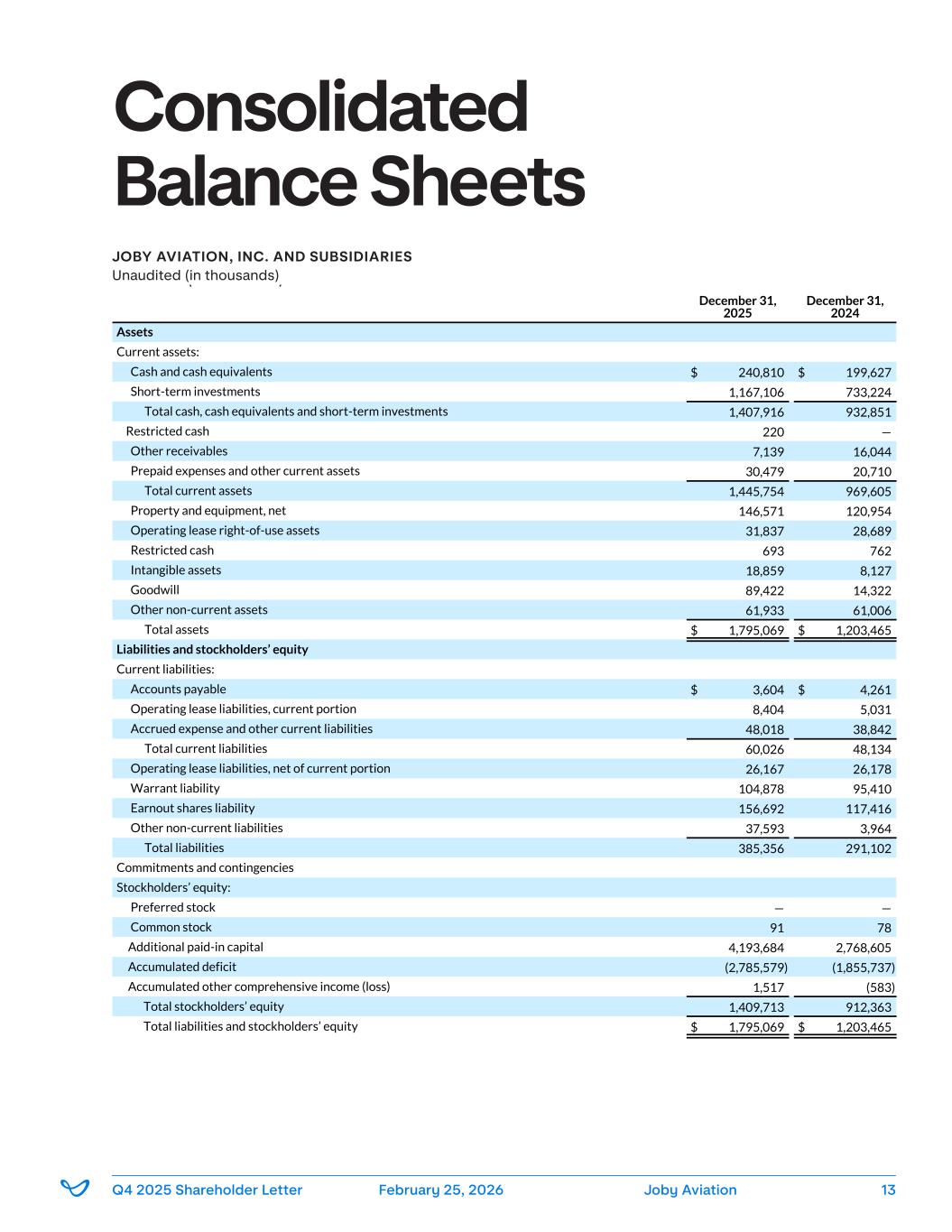 Consolidated Balance Sheets JOBY AVIATION, INC. AND SUBSIDIARIES Unaudited (in thousands) Consolidated Balance Sheets JOBY AVIATION, INC. AND SUBSIDIARIES Unaudited (In thousands) December 31, 2025 December 31, 2024 Assets Current assets: Cash and cash equivalents $ 240,810 $ 199,627 Short-term investments 1,167,106 733,224 Total cash, cash equivalents and short-term investments 1,407,916 932,851 Restricted cash 220 — Other receivables 7,139 16,044 Prepaid expenses and other current assets 30,479 20,710 Total current assets 1,445,754 969,605 Property and equipment, net 146,571 120,954 Operating lease right-of-use assets 31,837 28,689 Restricted cash 693 762 Intangible assets 18,859 8,127 Goodwill 89,422 14,322 Other non-current assets 61,933 61,006 Total assets $ 1,795,069 $ 1,203,465 Liabilities and stockholders’ equity Current liabilities: Accounts payable $ 3,604 $ 4,261 Operating lease liabilities, current portion 8,404 5,031 Accrued expense and other current liabilities 48,018 38,842 Total current liabilities 60,026 48,134 Operating lease liabilities, net of current portion 26,167 26,178 Warrant liability 104,878 95,410 Earnout shares liability 156,692 117,416 Other non-current liabilities 37,593 3,964 Total liabilities 385,356 291,102 Commitments and contingencies Stockholders’ equity: Preferred stock — — Common stock 91 78 Additional paid-in capital 4,193,684 2,768,605 Accumulated deficit (2,785,579) (1,855,737) Accumulated other comprehensive income (loss) 1,517 (583) Total stockholders’ equity 1,409,713 912,363 Total liabilities and stockholders’ equity $ 1,795,069 $ 1,203,465 Q4 2025 Shareholder Letter February 26, 2025 Joby Aviation FS-2 Joby AviationQ4 2025 Shareholder Letter February 25, 2026 13