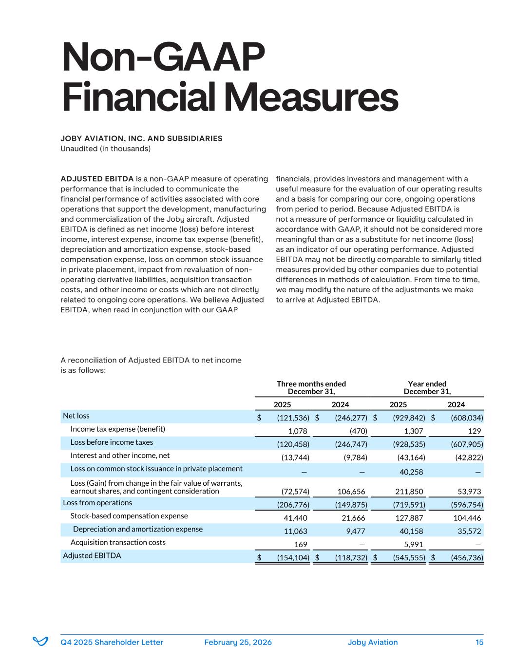 Non-GAAP Financial Measures JOBY AVIATION, INC. AND SUBSIDIARIES Unaudited (in thousands) ADJUSTED EBITDA is a non-GAAP measure of operating performance that is included to communicate the financial performance of activities associated with core operations that support the development, manufacturing and commercialization of the Joby aircraft. Adjusted EBITDA is defined as net income (loss) before interest income, interest expense, income tax expense (benefit), depreciation and amortization expense, stock-based compensation expense, loss on common stock issuance in private placement, impact from revaluation of non- operating derivative liabilities, acquisition transaction costs, and other income or costs which are not directly related to ongoing core operations. We believe Adjusted EBITDA, when read in conjunction with our GAAP financials, provides investors and management with a useful measure for the evaluation of our operating results and a basis for comparing our core, ongoing operations from period to period. Because Adjusted EBITDA is not a measure of performance or liquidity calculated in accordance with GAAP, it should not be considered more meaningful than or as a substitute for net income (loss) as an indicator of our operating performance. Adjusted EBITDA may not be directly comparable to similarly titled measures provided by other companies due to potential differences in methods of calculation. From time to time, we may modify the nature of the adjustments we make to arrive at Adjusted EBITDA. A reconciliation of Adjusted EBITDA to net income is as follows: Non-GAAP Fina cial Measures JOBY AVIATION, INC. AND SUBSIDIARIES Unaudited (In thousands) ADJUSTED EBITDA is a non-GAAP measure of operati g performance that is included o communicate the financial performance of activities ssociated with core operations that support the development, manufacturing and commercialization of the Joby aircraft. Adjusted EBITDA is defined as net income (loss) before interest income, interest expense, income tax expense (be efit), depreciation and amortization expens , stock-based compensation expense, loss on common stock issuance in private placement, impact from revaluation of non-operating derivative liabilities, acquisition transaction costs, and other income or costs which are not directly related to ongoing core operations. We bel eve Adjus ed EBITDA, when read in conjunction with our GAAP financials, provides investors and management with a useful measur for the evaluation of our operating results an a basis for comparing our core, ongoing operations from period to period. Because Adjusted EBITDA is not a measure of performance or liquidity calculated in accordance with GAAP, it should not be considered more meaningful than or as a substitute for n t income (loss) as an indicator of our operating performanc . Adjusted EBITDA may not be directly comparable to similarly titled measures provided by other companies due to potential differences in methods of calculation. From time to time, we may modify the nature of the adjustments we make to arrive at Adjusted EBITDA. A reconciliation of Adjusted EBITDA to net income is as follows: Three months ended December 31, Year ended December 31, 2025 2024 2025 2024 Net loss $ (121,536) $ (246,277) $ (929,842) $ (608,034) Income tax expense (benefit) 1,078 (470) 1,307 129 Loss before income taxes (120,458) (246,747) (928,535) (607,905) Interest and other income, net (13,744) (9,784) (43,164) (42,822) Loss on common stock issuance in private placement — — 40,258 — Loss (Gain) from change in the fair value of warrants, earnout shares, and contingent consideration (72,574) 106,656 211,850 53,973 Loss from operations (206,776) (149,875) (719,591) (596,754) Stock-based compensation expense 41,440 21,666 127,887 104,446 Depreciation and amortization expense 11,063 9,477 40,158 35,572 Acquisition transaction costs 169 — 5,991 — Adjusted EBITDA $ (154,104) $ (118,732) $ (545,555) $ (456,736) Q4 2025 Shareholder Letter February 26, 2025 Joby Aviation FS-4 Joby AviationQ4 2025 Shareholder Letter February 25, 2026 15