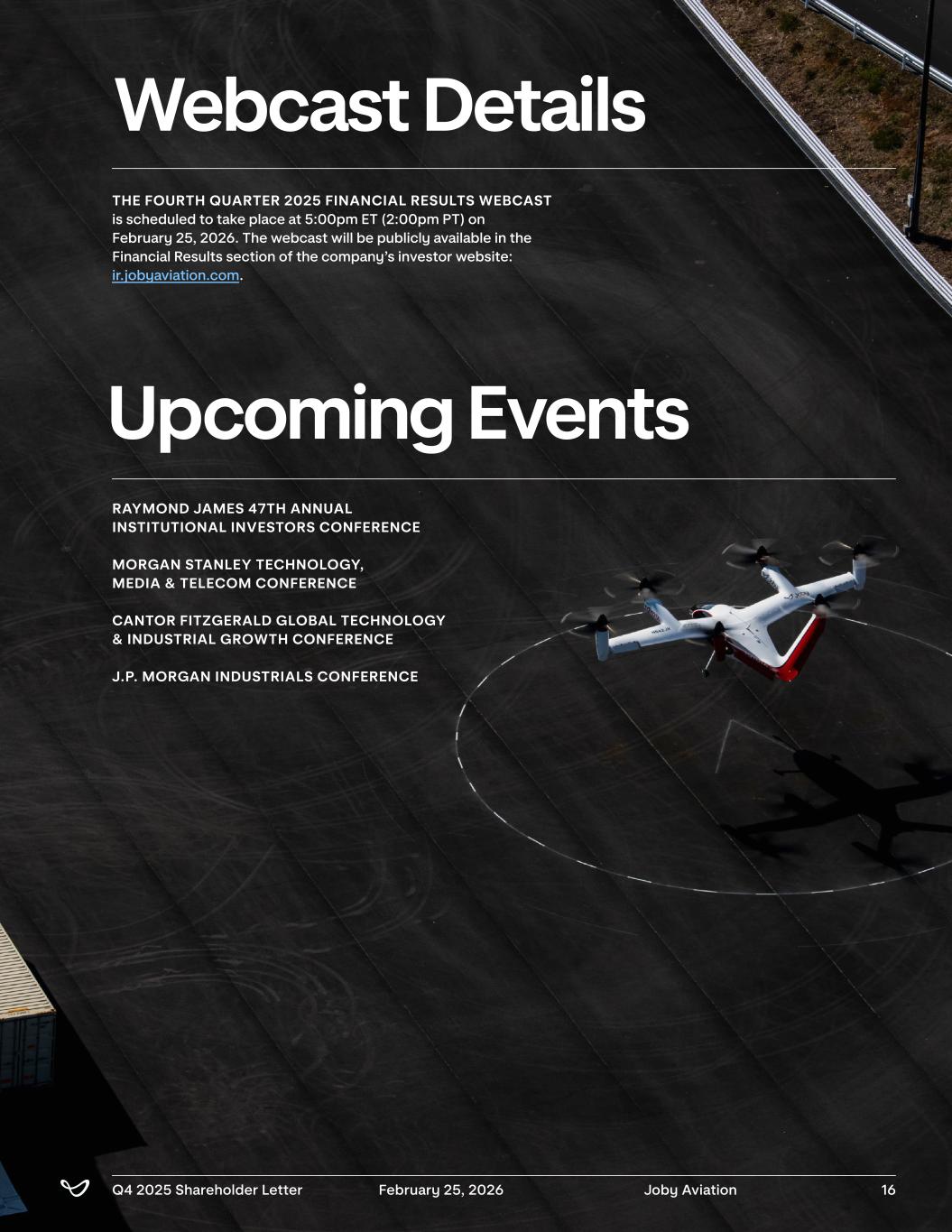Upcoming Events Webcast Details THE FOURTH QUARTER 2025 FINANCIAL RESULTS WEBCAST is scheduled to take place at 5:00pm ET (2:00pm PT) on February 25, 2026. The webcast will be publicly available in the Financial Results section of the company’s investor website: ir.jobyaviation.com. RAYMOND JAMES 47TH ANNUAL INSTITUTIONAL INVESTORS CONFERENCE MORGAN STANLEY TECHNOLOGY, MEDIA & TELECOM CONFERENCE CANTOR FITZGERALD GLOBAL TECHNOLOGY & INDUSTRIAL GROWTH CONFERENCE J.P. MORGAN INDUSTRIALS CONFERENCE Joby AviationQ4 2025 Shareholder Letter February 25, 2026 16